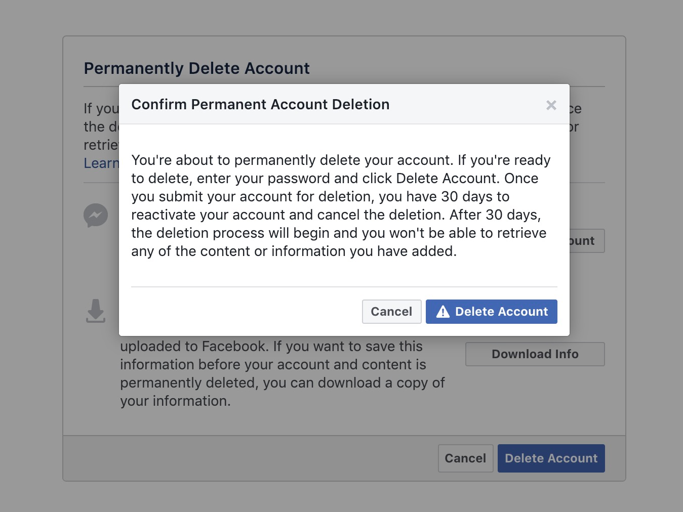 "Confirm Permanent Account Deletion" dialogue from Facebook